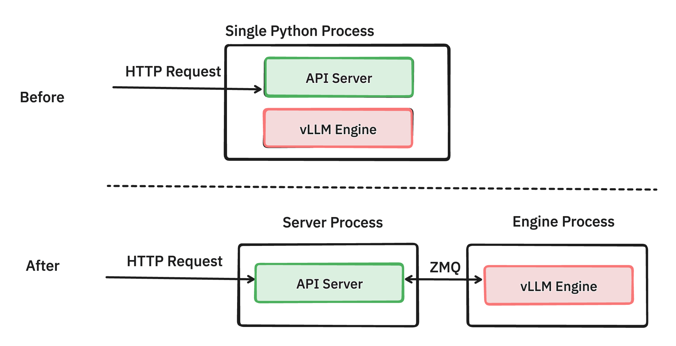 Our solution is to separate out the API server, which handles request validation, tokenization, and JSON formatting, from the engine, which manages request scheduling and model inference. We connect these two Python processes using ZMQ, which has low overhead. By eliminating GIL constraints, both components can operate more efficiently without CPU contention, leading to improved performance.