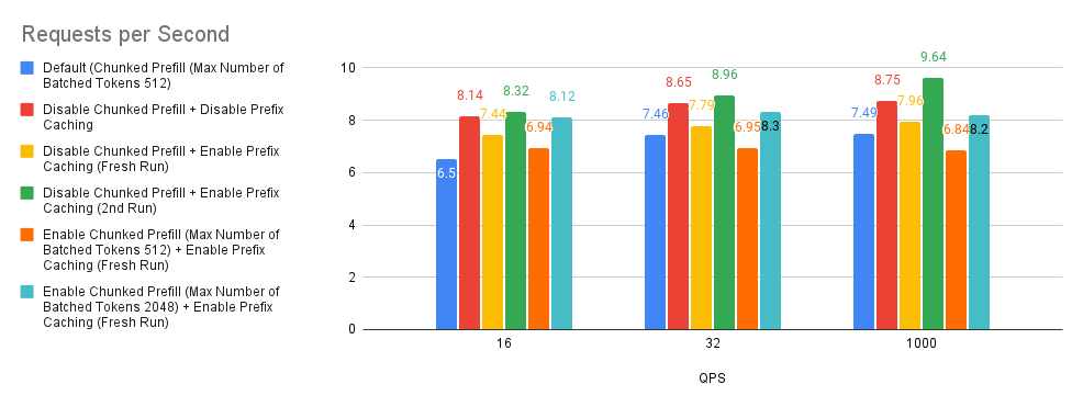 - In our experiments we found that the prefix caching hit rates of Bar 3 (yellow) and Bar 4 (green) are around 0.9% and 50%. Based on the comparison of Bar 3 (yellow) and Bar 4 (green) with the baseline and Bar 2 (red), this tells us that if the user requests do not have high prefix caching hit rate, disabling both chunked prefill and prefix caching might be considered a good rule of thumb.