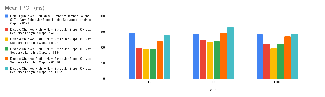 --num-scheduler-stepsto a value between 10 and 15 to optimize GPU utilization and performance. - Prefix Caching: Combining prefix caching with chunked prefill can enhance performance in specific scenarios. However, if user requests have a low prefix caching hit rate, it might be advisable to disable both chunked prefill and prefix caching.